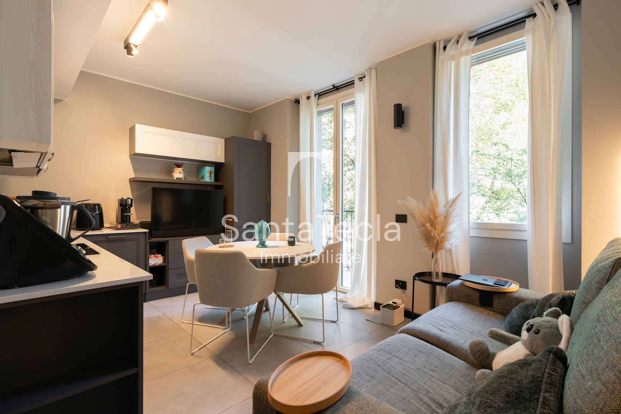 The apartment, of 50 sqm, immediately welcomes in the large living area, without corridors or wasted spaces. The living room with an open kitchen signed Lube is the beating heart of the house, ideal for those who like to live environments in a functional and convivial way. From here it accesses the balcony, with an open view of Mac Mahon Street.