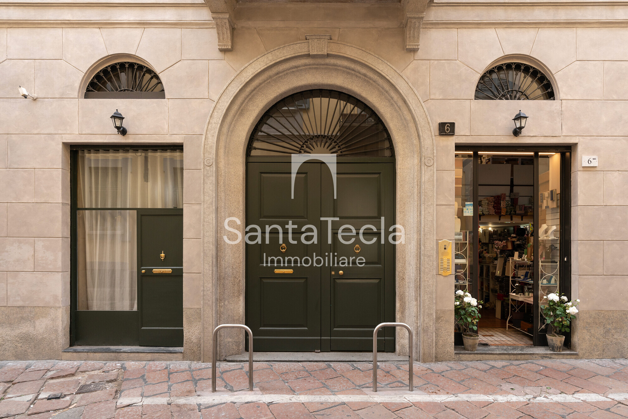 In the beating heart of Milan, on Via dei Piatti, a few steps from the Duomo and the most renowned shopping streets, stands an elegant apartment located on the third floor of a charming period building.