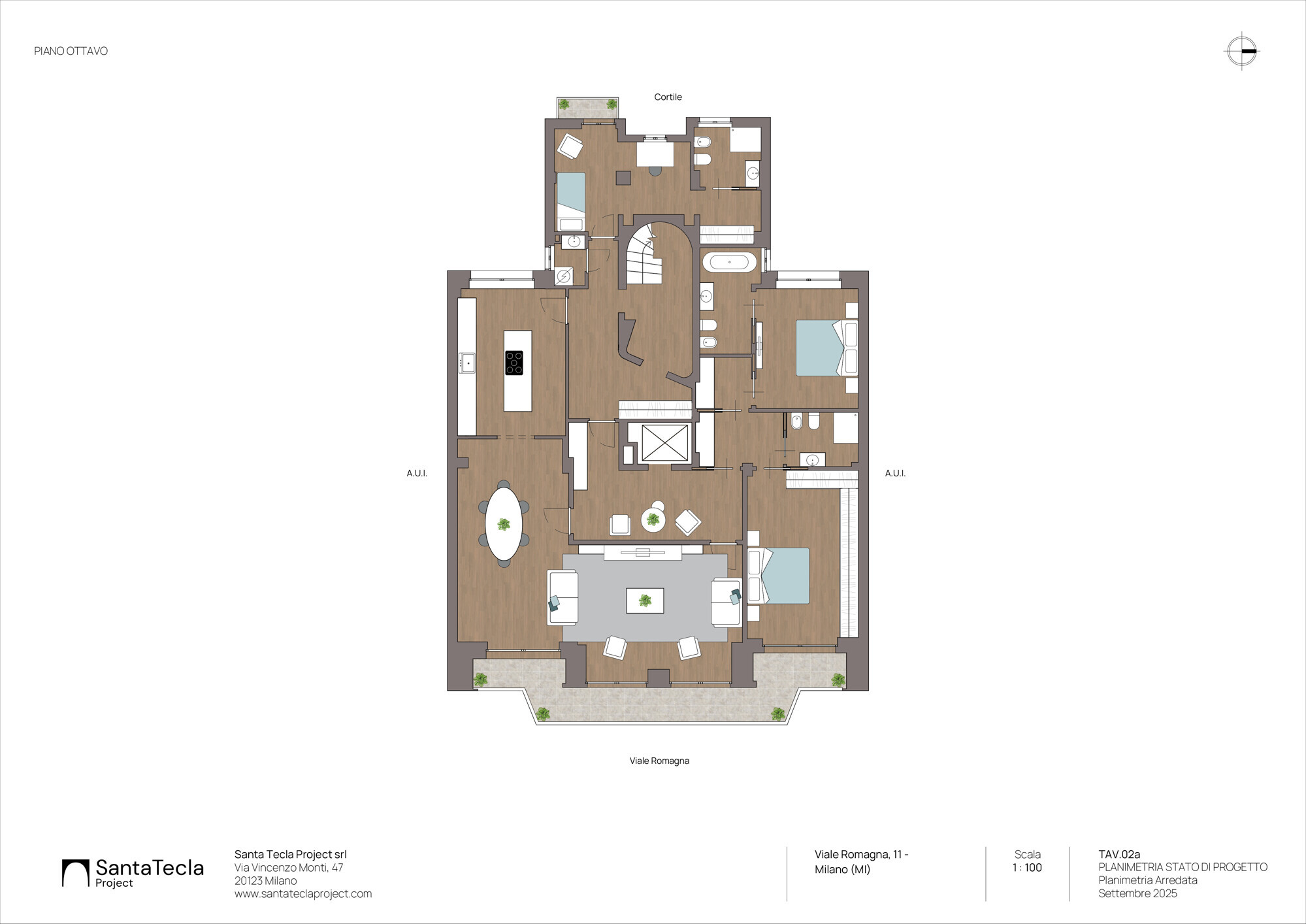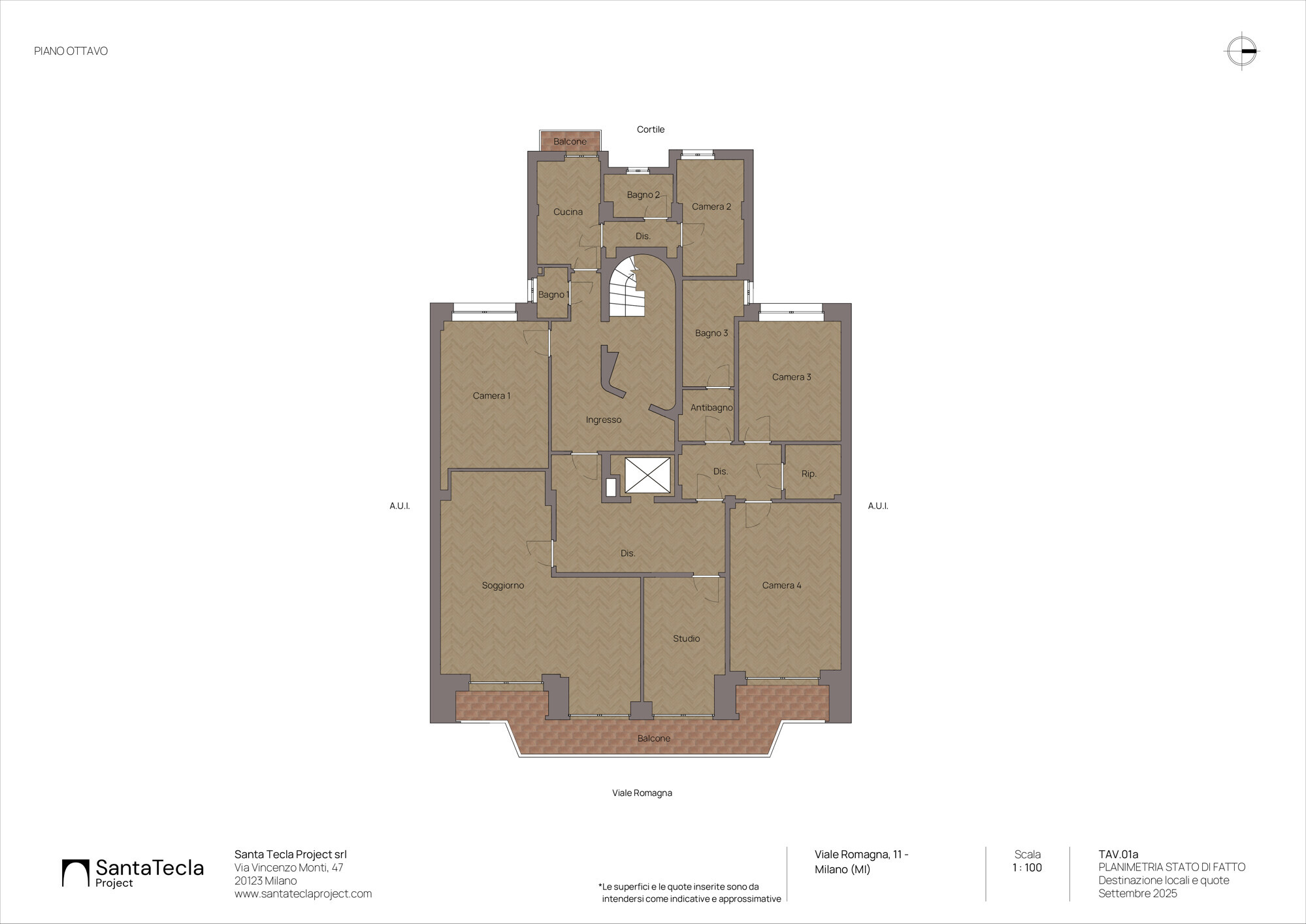 Dall’ampio ingresso si accede al soggiorno doppio e allo studio entrambi affacciati sul lungo balcone dal quale si gode una meravigliosa vista su Milano ad est. Dall’ingresso si accede a due zone notte che si distribuiscono a U, con 4 camere e 3 bagni, oltre a una lavanderia. In questa zona troviamo gli altri due ingressi all’appartamento che collegano con il vano scala dal quale si accede al piano 9° con il grande terrazzo.