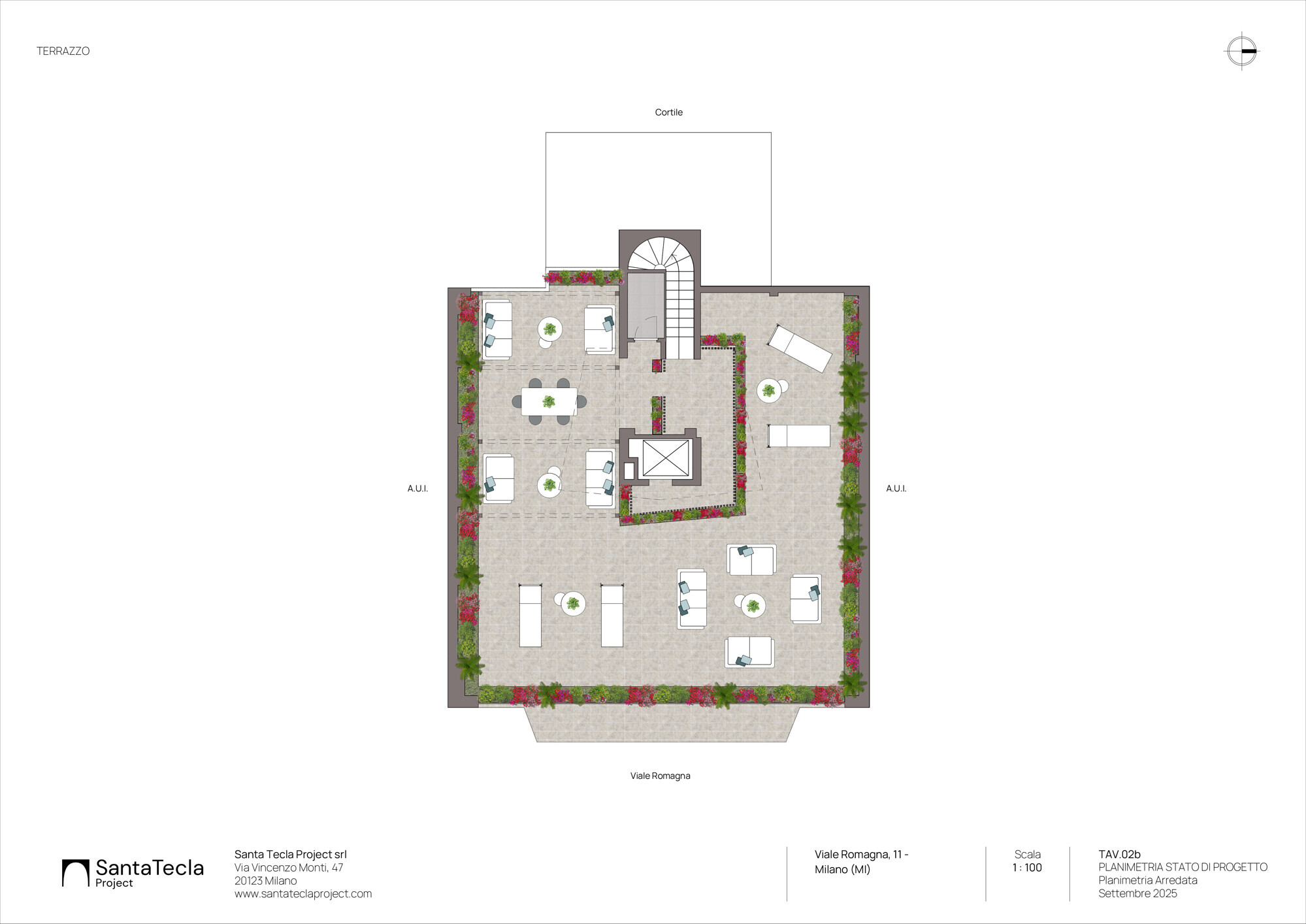 Il terrazzo si presta alla costruzione di un bellissimo giardino pensile, viene qui presentata una soluzione di arredo con il verde e con la creazione di un volume vetrato.