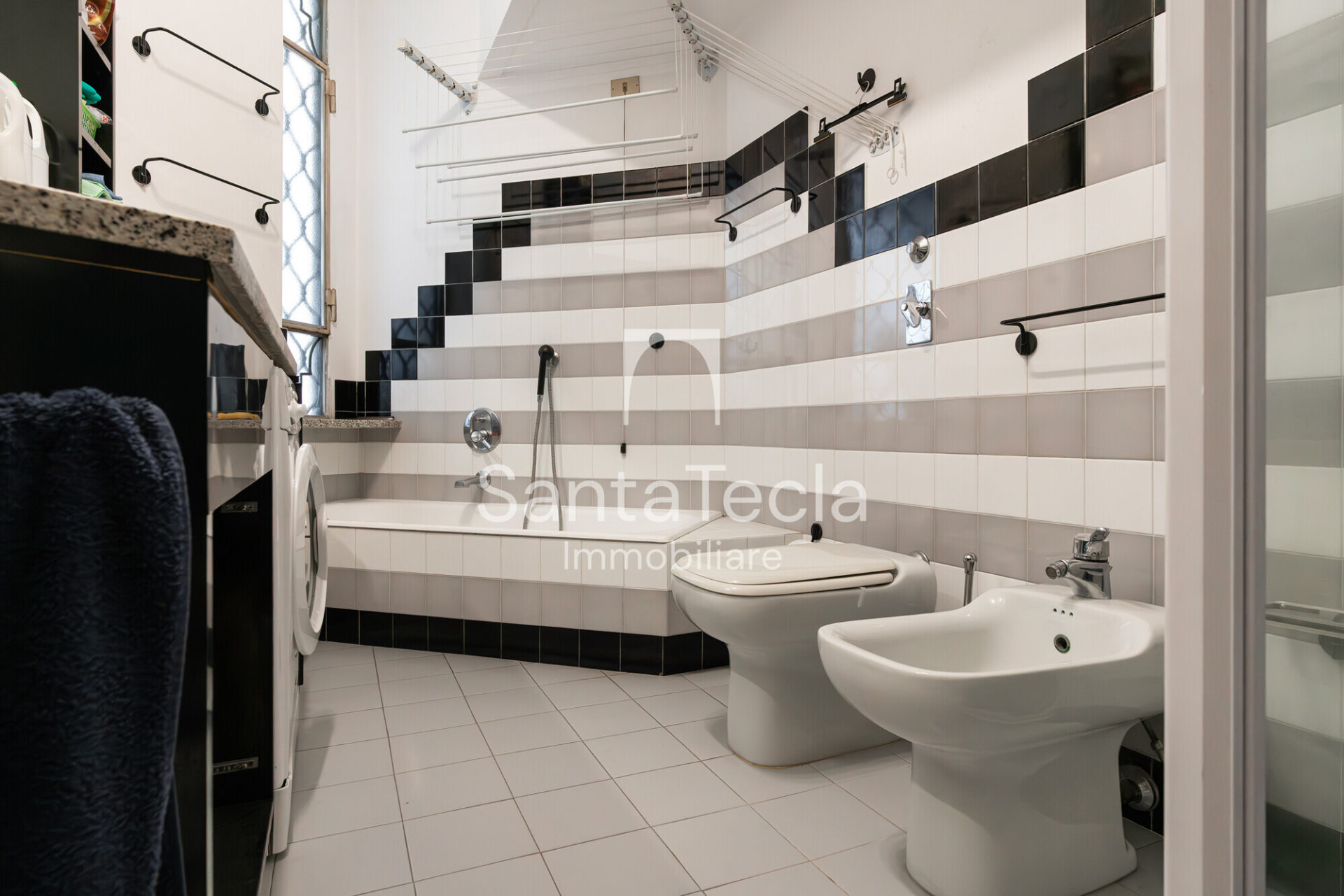 Una scala interna in parquet di rovere chiaro conduce al terzo piano, dove si trovano due camere da letto attualmente a vista sulla zona giorno, facilmente separabili per garantire maggiore privacy. Le camere sono illuminate da infissi Velux e presentano soffitti con travi a vista in legno laccato bianco, conferendo un tocco di charme e calore all’ambiente. Completano il piano due bagni moderni, una spaziosa cabina armadio e una zona sottotetto con altezza centrale di 1,80 metri, ideale come ripostiglio.